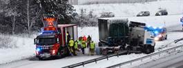 En lastbil körde under eftermiddagen in i mitträcket utanför Borås. Minst 50 meter av mitträcket är nedkört.