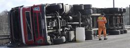 Lastbilen ligger väl vid sidan av vägen och det är oklart om någon har skadat sig i samband med olyckan.